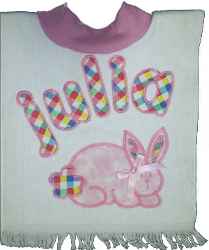 bunny bib ~ Our bibs are made from 100% cotton fingertip towels. The ribbed neckband slips easily over baby's head. Some think these bibs are too cute to get dirty with baby's splatterings. Rest assured, however, these are as practical as they are pretty. Cost is $35.