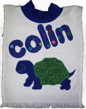 Our bibs are made from 100% cotton fingertip towels. The ribbed neckband slips easily over baby's head. Some think these bibs are too cute to get dirty with baby's splatterings. Rest assured, however, these are as practical as they are pretty. Cost is $35.